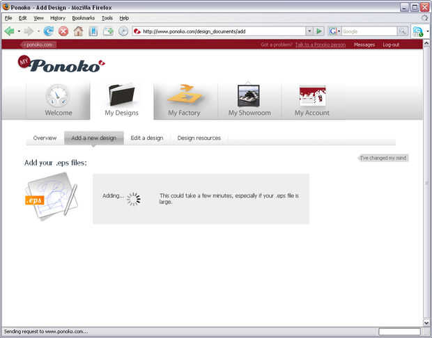 4) haga clic en "agregar este archivo del diseño" para completar el proceso para subir tu diseño a tu cuenta de Ponoko.