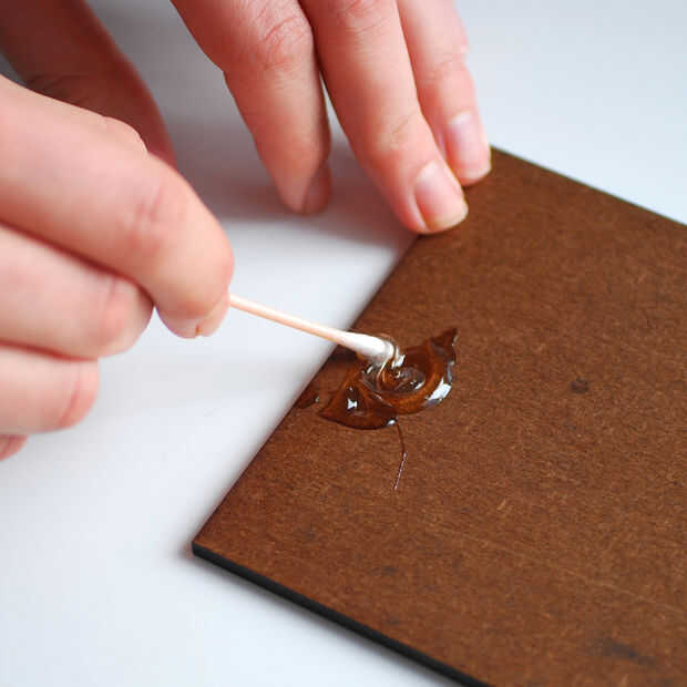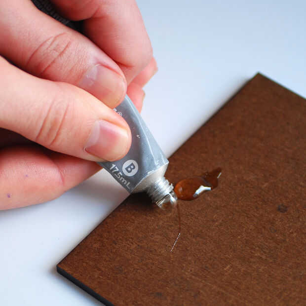 Luego aplique una pequeña cantidad de pegamento desde el primer tubo sobre un trozo de madera. Luego la misma cantidad del otro tubo. (Siga las instrucciones según el fabricante del pegamento).