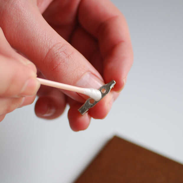 Les mezcle bien y aplique una pequeña cantidad en la parte posterior del perno. Pegar luego el pasador hacia abajo aproximadamente en el centro del disco.