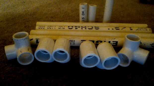 -4  pieces of 11 inch PVC pipe                                                                                                                                                                        -2 "90"degree side outlets                                                                                                                                                                              -4 "90" degree fittings                                                                                                                                                                                     -1 piece of 3 inch PVC pipe                                                                                                                                                                            -2 pieces of 2 inch PVC pipe