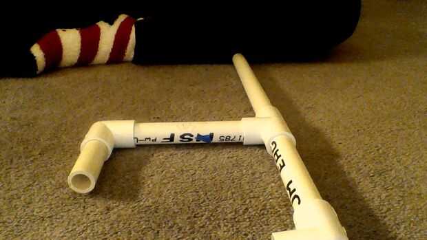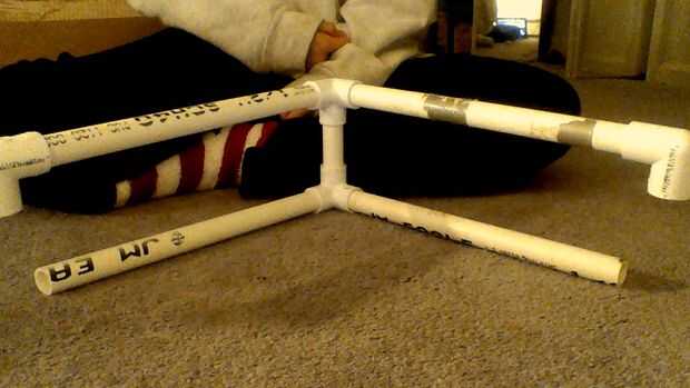En el sexto paso de la creación de la letra V de la pipa del PVC, tendrá dos piezas de 90 grados.                                                                     Usted conecte bien uno de los accesorios de 90 grados hasta el final de la tubería de PVC de 11 pulgadas que se encuentra en la parte superior. Luego conectas el otro de 90 grados en el otro tubo de PVC de 11 pulgadas que está en la parte superior de la V. Las guarniciones de 90 grados deben ser hacia abajo.       El sexto paso a la creación de la letra P de tubo de PVC necesita un trozo de tubo de PVC de 2.5 pulgadas.                                                     Se conectará la tubería de PVC de 2.5 pulgadas a la parte superior de la guarnición de 90 grados que es hacia arriba.