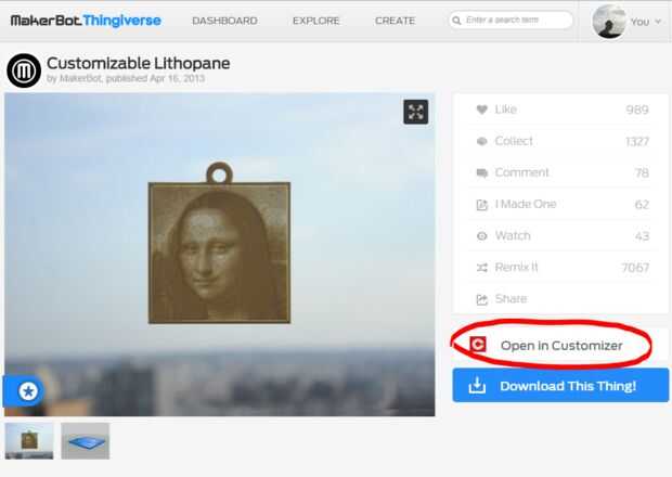 Encontrar la mona lisa lithopane de makerbot en thingiversehttp://www.thingiverse.com/thing:74322, haz clic en botón "Abrir en Customizer".