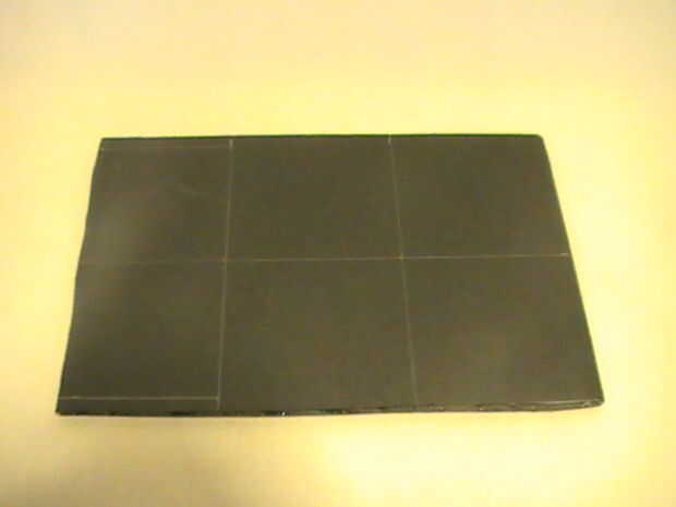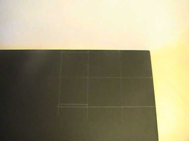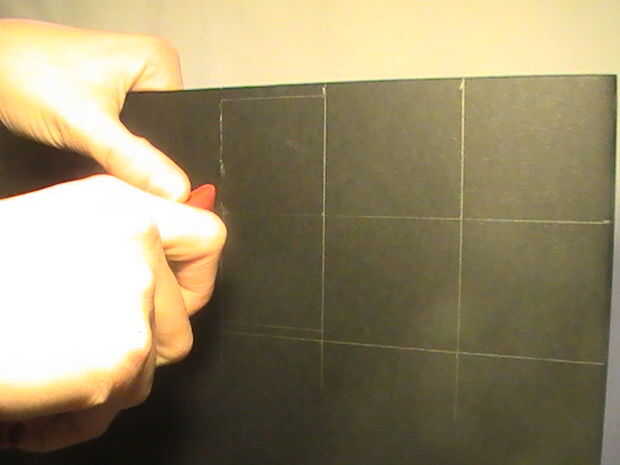 Todo es de 17 por 11 cm. hay cuatro azulejos 5.5 X 6 cm., dos 5 X 5 cm y dos tiras de 5X0.5 cms.. Usted puede hacer por separado, pero me gusta hacer el azulejo entero. Mantener las tiras! Se utilizará más adelante. Utiliza un lápiz y una regla para marcar esta plantilla y luego utiliza mi cuchillo de caja hacer lentamente hacia fuera y aparte. Antes de hacer este paso, considere la posibilidad de conectar la pistola de pegamento caliente si lleva un tiempo para calentar.