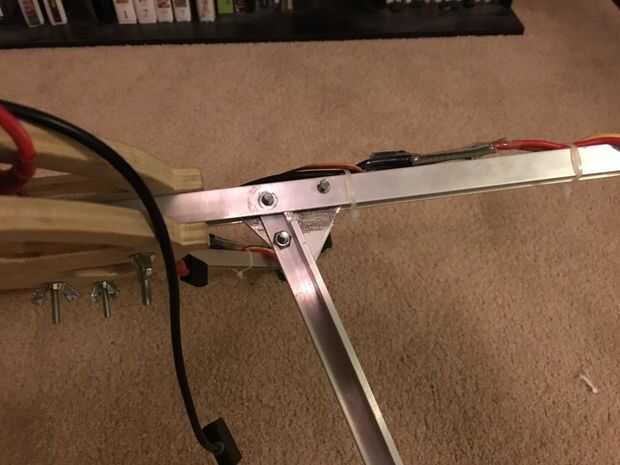 Para el tren de aterrizaje plegable me hecho una plantilla de 3 mm de la capa luego utilizan para duplicar el aluminio 4 que necesitaba de 12x2mm bar. Eran fabricados de una pieza de la barra de 12x2mm y dependía de un tornillo de M3. El perno atraviesa completamente el canal C para aumentar la rigidez y fue asegurado con buen ol ' nylocks. Utiliza clips de RC para fijarlos en la posición hacia abajo y perforar los agujeros para reducir el peso.