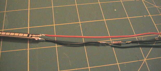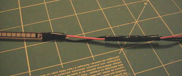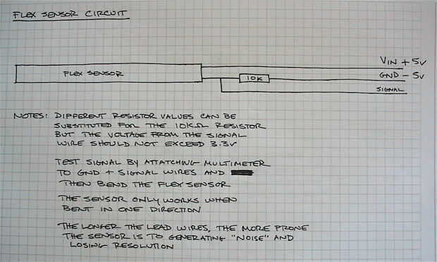 Corte tres igualan longitudes de alambre 22ga - uno rojo, uno negro y otro color para la señal de cable. Soldar el flex sensor como se muestra en el diagrama. En general, el más corto puede mantener los cables de que los sensores de flex mejor tienden a perder resolución y obtener "ruidoso" como los cables más largos. Era capaz de hacer los cables lo suficientemente largos para llegar a mi mano y aún obtener buenos resultados.
