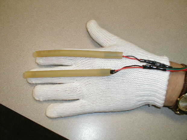 Pongo sobre mis conexiones soldadas de la tubería del encogimiento del calor y pegados algunos tubos de goma flexible en un guante y se deslizó los sensores en el tubo. Es importante tener en cuenta que los sensores sólo funcionan cuando estas en una dirección-el lado impreso del sensor va en el exterior de la curva.