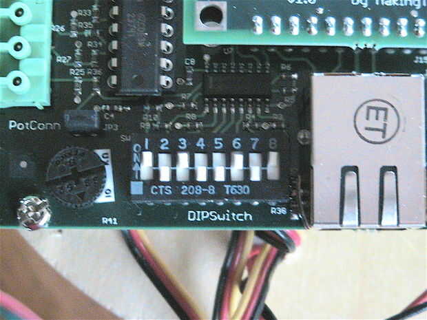 En primer lugar, tienes que fije los conmutadores DIP en el tablero (hay ocho de ellos) para poner el controlador en el modo POLY y activar el programa seguidor. Esto se hace colocando interruptores de 1, 3, 6 y 8 en posición ON. 3 activa el modo de seguidor de la primera serie de entradas analógicas y 6 activa el segundo conjunto de entradas analógicas. Hay más información sobre las funciones de modo poli aquí: