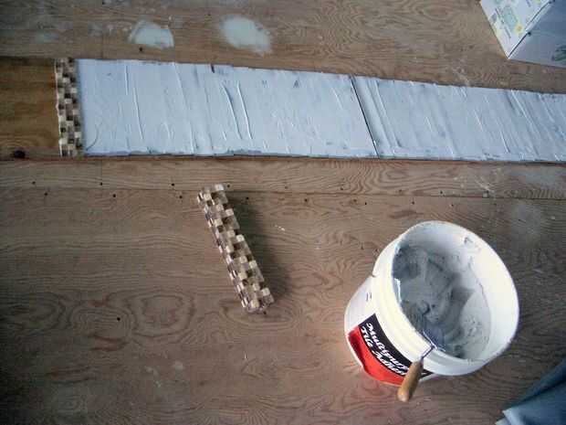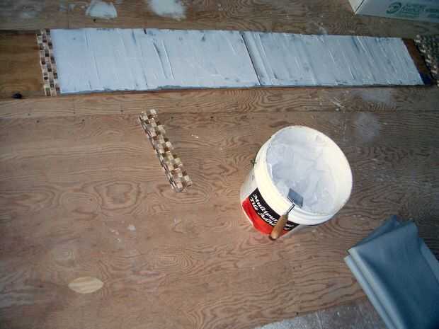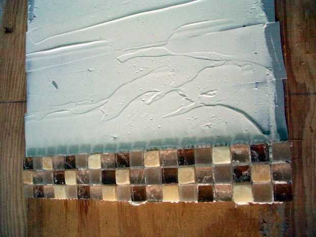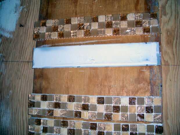 Nota: (No en la foto, aunque esta haya sido solicitada por más de 1 cliente en el pasado) Si desea agregar un "característica Dimensional 3 y"Levantar"el vidrio azulejos sobre azulejos de su campo... simplemente ADD una segunda capa de ducha pan liner y masilla (y asegúrese de no permita que se seca completamente; generalmente 1 día completo en un entorno de clima controlado tendrá la escritura hecha)... disminuyendo su lechada hasta el borde terminado es tan fácil snoopy podía hacerlo si él podría tener una esponja de lechada! (él es aún bastante molesto por no obtener los 'dedos').