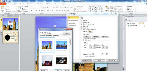 En lugar de mantener nuestra primera diapositiva simplemente, elegir agregar fondo. La idea de añadir la imagen del Big Ben está debido al lugar elegido "Buckinghamshire". También, la imagen parece llevar la envolvente de vuelo sobre un país. Pero es simplemente opcional. Puede agregar cualquier fondo para todos los gustos.