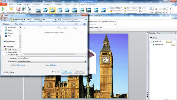 Una vez hecho todo lo necesario para la tarjeta, es hora de publicar nuestro archivo como "PowerPoint Show". Este archivo puede enviarse por correo en cualquier lugar y aquellos que abre el archivo, veremos una boda animada postal. El archivo de salida de la tarjeta puede verse al principio de este Instructable.