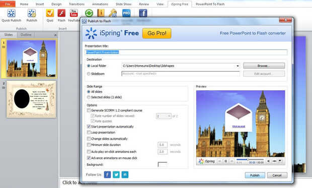Para convertir la plantilla de PowerPoint archivo flash, descarga el iSpring Free software -> abrir el PowerPoint -> haga clic en iSpring Free de la barra de menú-> haga clic en publicar