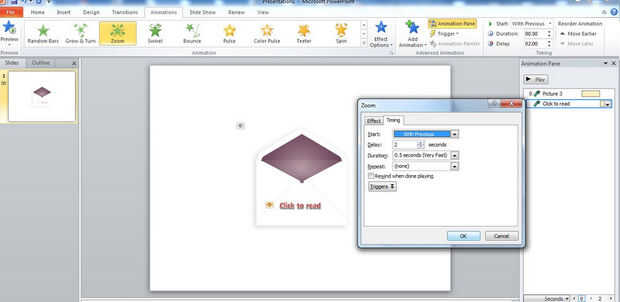 Aquí el retraso hace que el texto que aparezca después de 2 segundos que la envuelve terminar su propia animación. El orden de animación en la que aparezcan se observa en el lado derecho "Panel de animación".