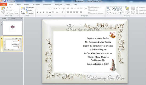 Ahora, agregue el resto de las imágenes como las campanas de boda y la tarta desde el archivo zip en la tarjeta utilizando la opción "Insertar imagen". Decido mantener las imágenes mínimo va a tener una animación de vídeo incrustada dentro de la tarjeta.