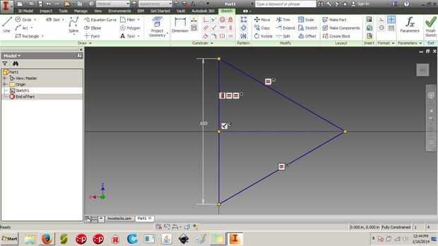 Abra una nueva pieza en inventor. Seleccionar un plano y empezar un dibujo nuevo. Dibuja un triángulo simple y luego añadir la restricción de igualdad a cada lado.
