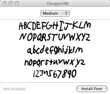 Ahora que tiene su fuente, es momento de instalarlo! Ir a la carpeta de descargas y haga doble clic en la fuente. Aparecerá una ventana de vista previa de su fuente. Haga clic en "Instalar". Ejecutar el software de procesamiento de textos, y su fuente debe estar en la lista! ¡ Felicidades! Hiciste una fuente! Si te gustó la fuente que mostré en mis fotos, pueden descargarlo e instalarlo como cualquier otro tipo de letra aquí: http://www.mediafire.com/file/3p5fc9i232j4pm9/Dougies%20Handwriting.ttf