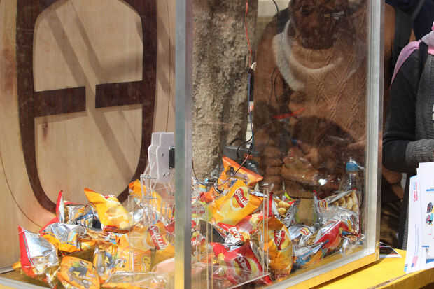 Y en nuestro caso he utilizado protector Gamepad que es una GUI en mi smartphone que tiene algunos botones como joystick de PlayStation conectado a Arduino a través de Bluetooth y controlan los motores de mi máquina para coger un caramelo y luego ponerlo en la caja en la esquina inferior izquierda.