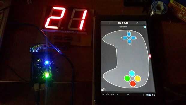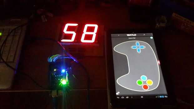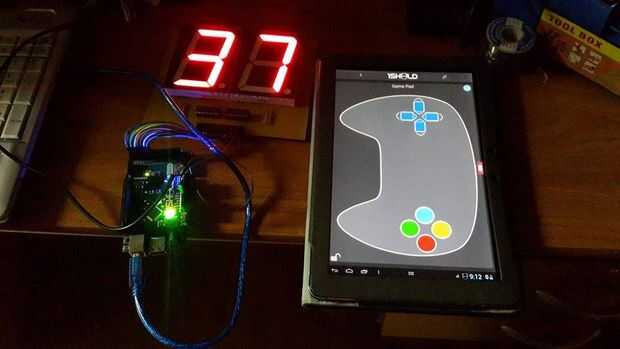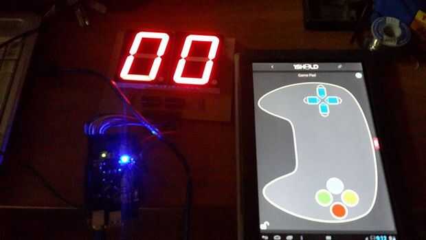 Aplicación móvil de 1Sheeld tiene una larga lista de escudos, debe seleccionar protector de cojín del juego de esta lista. La aplicación móvil está conectada a 1Sheeld a través de Bluetooth. Cuando usted presiona cualquier botón del escudo de Game pad la aplicación enviará datos al 1Sheeld y Arduino controla los motores a través del tablero de relés y el contador de 7 segmentos se cuenta abajo a partir de los 60 (1 minuto), cuando el contador llega a cero tu juego será largo y el teléfono inteligente será un juego sobre banda sonora :D
