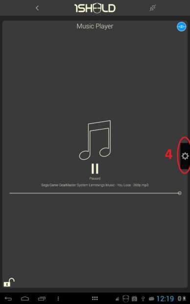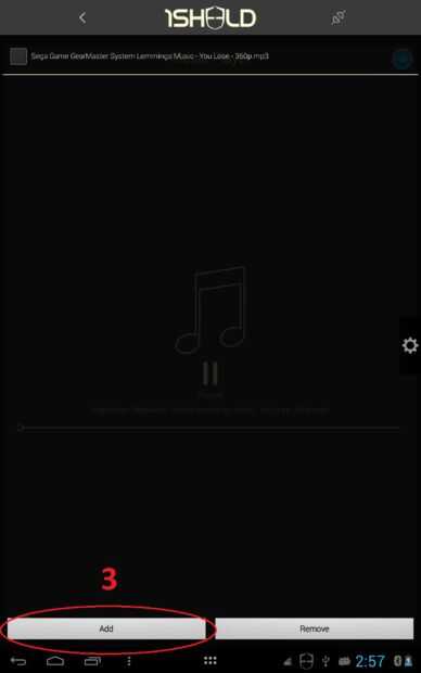 Para añadir la banda sonora, después de seleccionar los escudos de la lista, abra escudo de reproductor de música desde la esquina superior izquierda y pulsa en el icono de engranaje para añadir la banda sonora deseada de sus archivos.