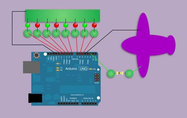 Conectar el LED a los pines de arduino 5,6,7,8,9,10,11 y 12 (Recuerde que no necesita resistencias con la masa)