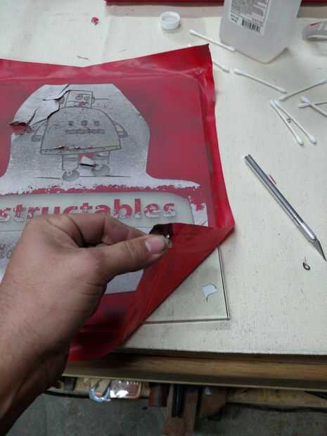 Nota: Este es un punto de no retorno, antes de retirar la plantilla, asegúrese su diseño es cuidadosamente grabado al agua fuerte.