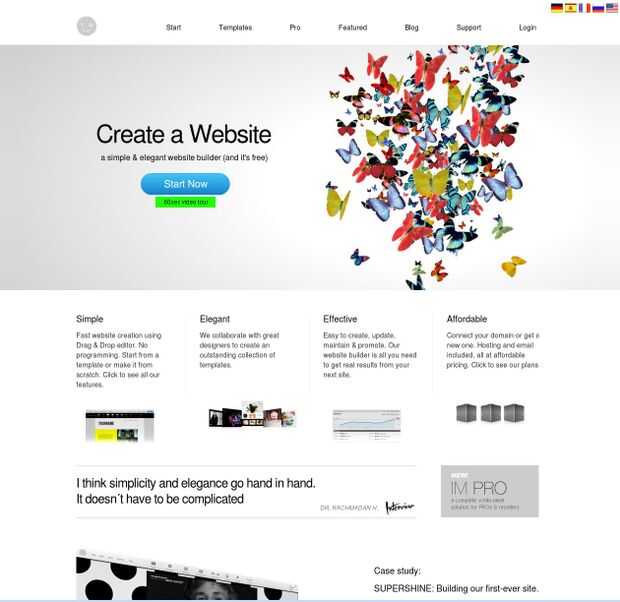 Creador de IM:-es otro constructor de sitio web que viene con más o menos las mismas características. Su almacenamiento de 50 MB es alentador y la herramienta de editor de arrastrar y soltar es útil. Sin embargo su USP radica en su impresionante gama de plantillas que se actualizarán mensualmente. Otro USP es su compatibilidad con los teléfonos celulares. Por lo tanto, aquellos que buscan a la audiencia móvil encontrará este generador de sitios de destino a medida para sus necesidades.