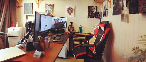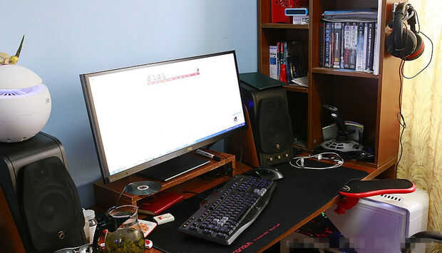 Y aquí está mi configuración de juego hoy en día, al menos hasta que me embarqué en este viaje. Mi monitor de monstruo tiene una relación de aspecto 21:9. Honestamente, era tipo de un error. Es ideal para ver películas pero no tanto para juegos. La mayoría de juegos no soporta esa relación, al menos sin algunos mods o trucos. Y aquí está mi humilde oficina. Un poco desordenado, lo sé. OK, vamos a empezar la construcción.