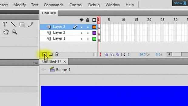En el panel Línea de tiempo, haga clic en el botón de "Nueva capa" hasta tener tres capas. Haga doble clic en cada capa para cambiar el nombre. A partir de la parte inferior, nombre de las capas: acciones, miniaturas y fotografías.