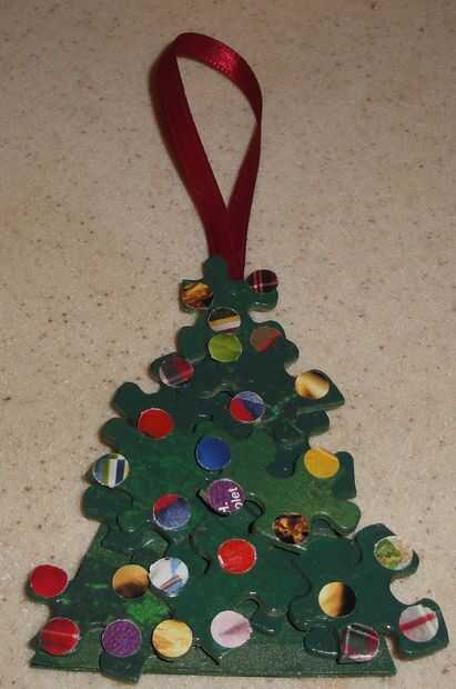 Una caja, un rompecabezas que faltan algunas piezas y un catálogo viejo se convirtieron en un adorno de árbol de Navidad muy bien. Se puede hacer prácticamente nada y se puede hacer por personas de todas las edades.