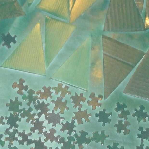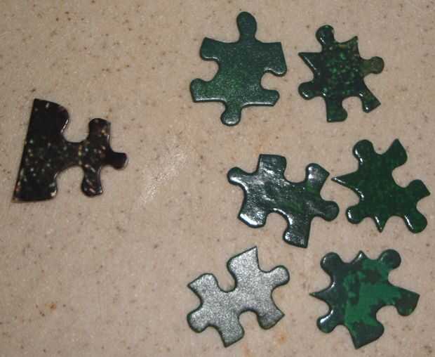 Puse los triángulos y las piezas del puzzle y rocía con la pintura. No necesita cubrir totalmente las piezas. Sólo necesitan mirar verde. La mayor parte de la cartulina debe estar cubierta por las piezas del puzzle así que realmente no ves. Le di las piezas del rompecabezas una fina capa de verde y que permitió la "textura" de la imagen subyacente a pesar. Las "ramas" menos plana miraban de esa manera.