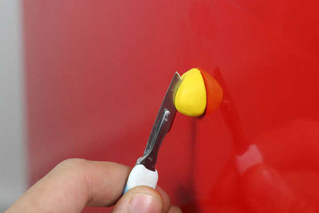 Consejo: Usando pequeños hacia adelante y hacia atrás con su bisturí, (clase de como cortar un trozo de pan), es una mejor manera de obtener un corte limpio que simplemente presionando hacia abajo.