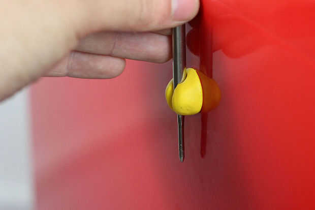 Para crear el agujero para el cable, queremos trabajar nuestro camino hasta el tamaño correcto con orificios para evitar deformar la sugru.