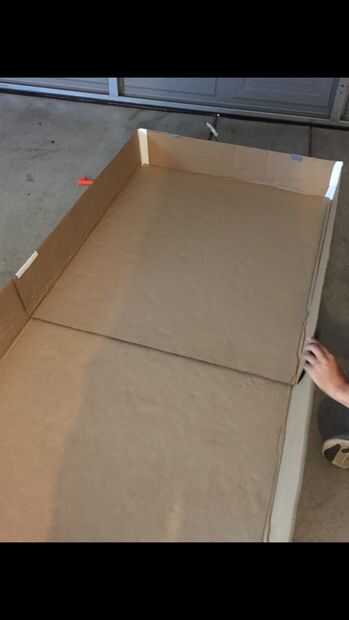 Para iniciar la salida de barco con dos planchas de cartón y un pie de cinta, poner los dos pedazos de cartón en el suelo y ponen de plano. Únalos con cinta adhesiva ambas planchas y que apenas se superponen entonces quieres plegar los bordes para hacer paredes y asegúrelas con cinta adhesiva como esta.