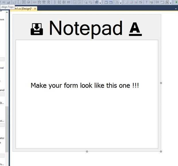 Ahora sólo tienes que arreglar los elementos en la forma que quieras. Aquí estoy poniendo la etiqueta en el centro de la forma y hacer una forma más grande y poniendo cada botón al lado de esa etiqueta y hacer el cuadro de texto más grande y poniendo en debajo de la etiqueta y también voy a cambiar los nombres de lo botones/etiqueta excepto el cuadro de texto. Como usted necesita para hacer su bloc de notas frío así que para que sea cool agregar imágenes en botones en lugar de texto.
