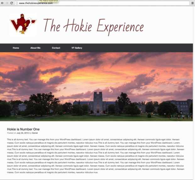WordPress ofrece bloggers con una gran variedad de temas a elegir para sus blogs. Navegar y utilizar el tema que mejor sirve a su blog. Como se muestra en la imagen de arriba, el tema, llamado "Vantage", se utilizará como plantilla para crear el blog titulado www.thehokieexperience.com, que es la segunda imagen.