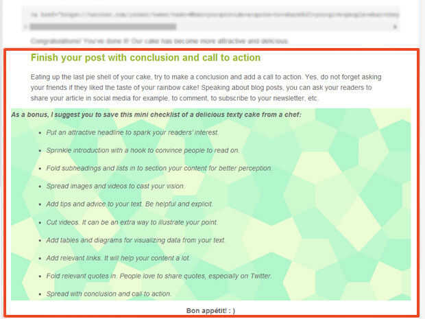 Conclusión y llamada a la acción son un final lógico de su entrada de blog. Cuando una persona termina de leer su artículo, aparece la pregunta: "y ahora qué?" o "¿Qué sigue?" ¿Qué debe hacer después de leer tu post: comentarla, suscribirse a tu blog, compartir con los demás, pensar en él, discutir los problemas que abarca? Hacerlo más fácil para tus lectores a entender por qué ha comprobado su escritura, lo que han aprendido de él, y lo que deben hacer con esta información ahora.