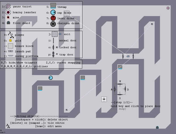 Comience con el ninja y la salida y añadir algunos enemigos y objetos. Cada objeto debe ser agregado con un propósito en mente. Nunca agregue objetos sólo para llenar espacio, esto lleva a mapas apariencia lanzada juntos. Pensar acerca de lo que le sucede al jugar a través de este mapa. ¿Agregar el objeto o enemigo contribuye al juego? Si no es así, es probablemente innecesario, y si no puede justificar su existencia, se debe eliminar en conjunto.