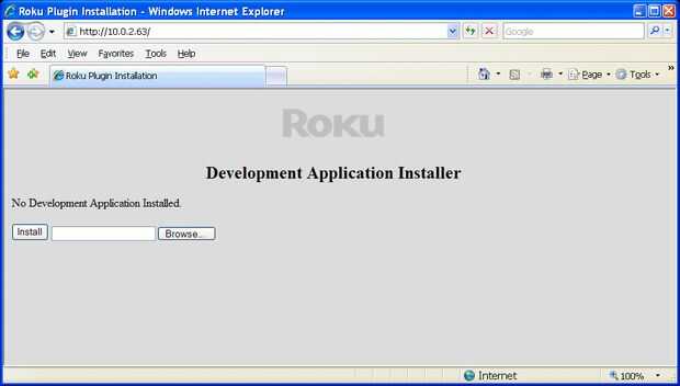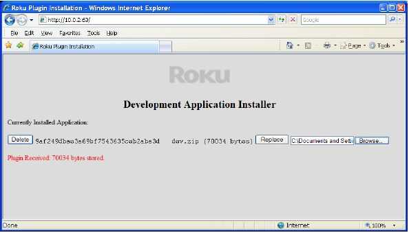 Abra la página Roku desarrollo aplicación web tecleando la dirección IP de su Roku. Busque el archivo zip que acabamos de crear, haga clic en instalar. Si su éxito, debería ver el canal de pop-up en la pantalla principal de Roku. ver las fotos de arriba.