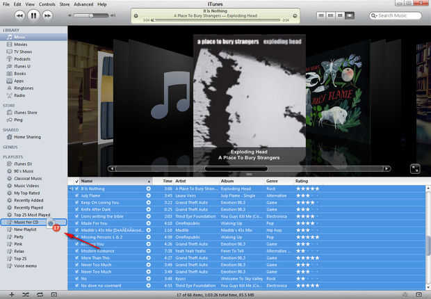 Ahora simplemente selecciona todas las canciones que desea grabar en el CD/DVD y arrastrar y soltarlos en la nueva lista de reproducción. Puede hacerlo varias veces hasta que tenga todas las pistas que necesita copiar a la nueva lista de reproducción.