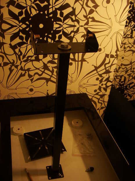 Separado las dos piezas del soporte (uno debe generalmente utilizar para fijarse a una pared y el otro a la pantalla), hacer un gran agujero con un taladro en el centro de la parte de la pared. Después Atorníllelo firmemente a la pierna.