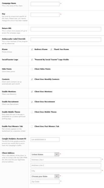 Esta sección contiene información como nombre de la campaña, volver URL, opciones de página y dirección del cliente. Toda esta información se copiarán de la chaqueta de trabajo.