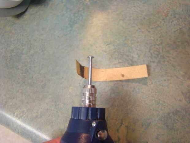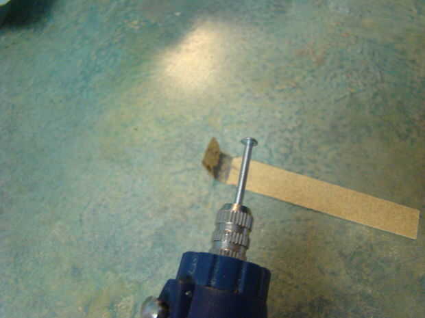 Hay 4 diferentes granos de lija, 120, 140, 180 y 220. Comenzar con la lija más gruesas, cachas ligeramente mojado, abrigo alrededor del eje y manteniendo apretado, encienda el taladro y ejecutar el papel de lija arriba y abajo de la longitud del eje expuesto axel. Repita con cada grado de papel de lija, va de más gruesas a más finas.
