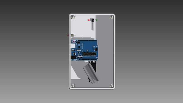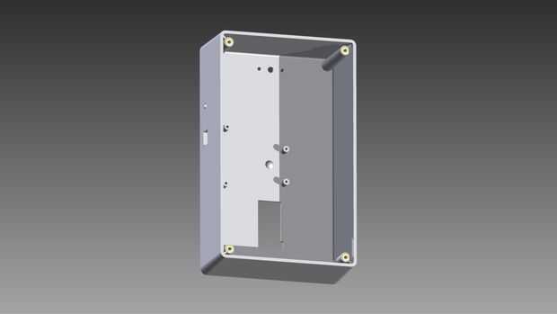Todos los modelos 3D fueron diseñados en Autodesk Inventor. Los componentes principales que la base de la caja se diseña alrededor son el servo y el Arduino Uno. Hice unas pequeñas modificaciones a este diseño a mano después de la impresión. Dos de estas modificaciones eran rendijas que corté para el servo y lector RFID cables para salir de la caja de la cinta. El lector de RFID debe montarse remotamente porque es demasiado gruesa para la señal obtener a través de la puerta. En mi caso, había montado en la ventana de la puerta. También perforé los agujeros de montaje para el servo con la mano. Para hacer esto, coloqué el servo en el agujero en la base de la caja y perforado a través de los 4 orificios en el servo usando un poco que era del mismo tamaño que los agujeros.