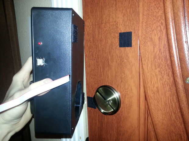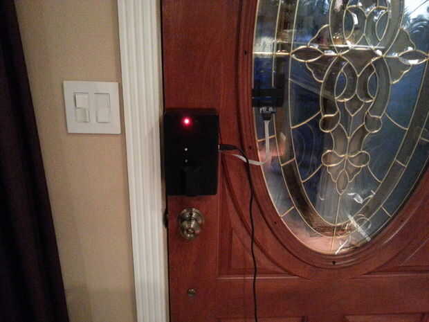 Con el pestillo regulador colocado sobre el pestillo y conectado, usted necesitará accionar el servo con el controlador en algunas posiciones para averiguar donde el servo está alineado con el punto de pivote para el cerrojo. Cuando usted accione el servo y no suena como se se cuela y el controlador no está en movimiento, luego se alinea. Usé velcro para montar el controlador de cerrojo a la puerta. Así, puedo quitarlo o hacer ajustes de posición ligeramente si es necesario.