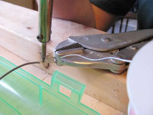 • Algunos componentes, como los terminales de conexión, pueden separarse en pedazos múltiples. Quitar la parte que está intentando adjuntar la soldadura a y plegado en una prensa reduce la posibilidad de la fusión accidental de plástico.