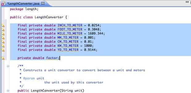 Las sólo otras variables de instancia puede que desee implementar en esta clase serían los que contienen los valores numéricos reales de los factores entre metros y otra medición de la longitud. Por ejemplo, el factor multiplicador entre pulgadas y metros es 0. 0254, así que puede ser útil crear una variable para este valor. Todas estas variables deben ser designados "final doble privada" que impide que el valor nunca ha sido modificado.