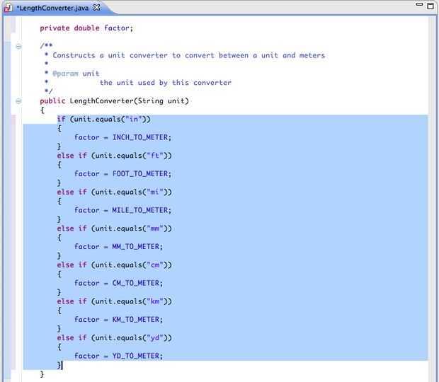 El constructor debe comprobar este parámetro unidades comunes de longitud (in, ft, mi, cm, yd, etc.), y debe establecer el valor de la variable de instancia factor por consiguiente. En el caso donde es el parámetro que pulgadas, factor debe establecerse en 0. 0254 porque una pulgada equivale a 0,0254 metros.