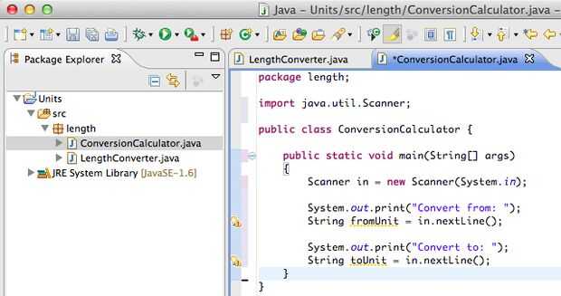 Con el fin de interactuar con el usuario, un programa debe utilizar un objeto Scanner. Un objeto Scanner puede leer lo que un usuario tipo en la línea de comandos. Este escáner leerá el valor numérico que el usuario desea convertir y las unidades que el usuario desea convertir de las unidades que el usuario desea convertir a.