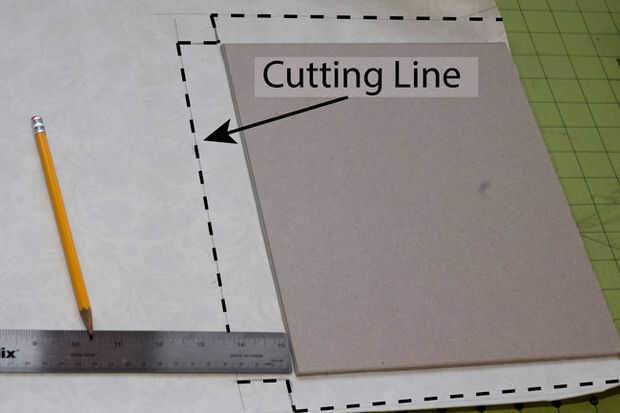 Con 11,5 "x 8,75" cartónLa como plantilla, alinéelo con un borde del papel decorativo para la portada del libro. Dibujar un rectángulo 1" fuera de la parte superior, inferior y un lado. Dibuja un pequeño cuadrado en las esquinas para crear la línea de corte, como se muestra.