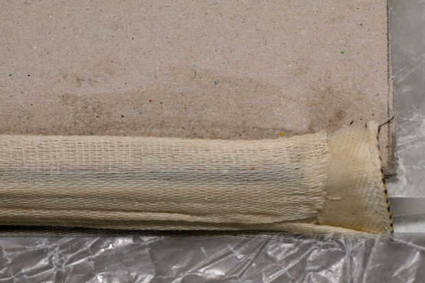 Los 2 pedazos de 11,75 "x 8,75" cartónLa se convertirá en la parte delantera y espalda cubiertas de tu libro. Coloque un pedazo de cartónLa encima de las páginas del libro. Agregue un trozo de papel de cera entre las páginas del libro y la cartónLa. La columna vertebral debe quedar al ras con el borde lateral de la cartónLa, y los bordes exteriores deben estar centrados sobre el papel. El correspondiente borde suelto de la cinta de libro del pegamento sobre la parte superior del borde lateral de la cartónLa. Dejar que ese lado seco, luego voltee el libro y repetir del otro lado con la segunda pieza de cartónLa. Déjelo secar.