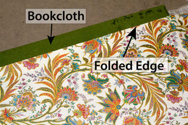 Suavemente ponga el papel encima de la cubierta delantera del libro.  El borde doblado debe correr paralelo a la columna vertebral. Dejar aproximadamente 3/4" de la bookcloth mostrando a lo largo del borde. Utilizar la herramienta de deshuesado para suavizar el papel.  Voltee el libro y abrirlo en el interior de la portada.